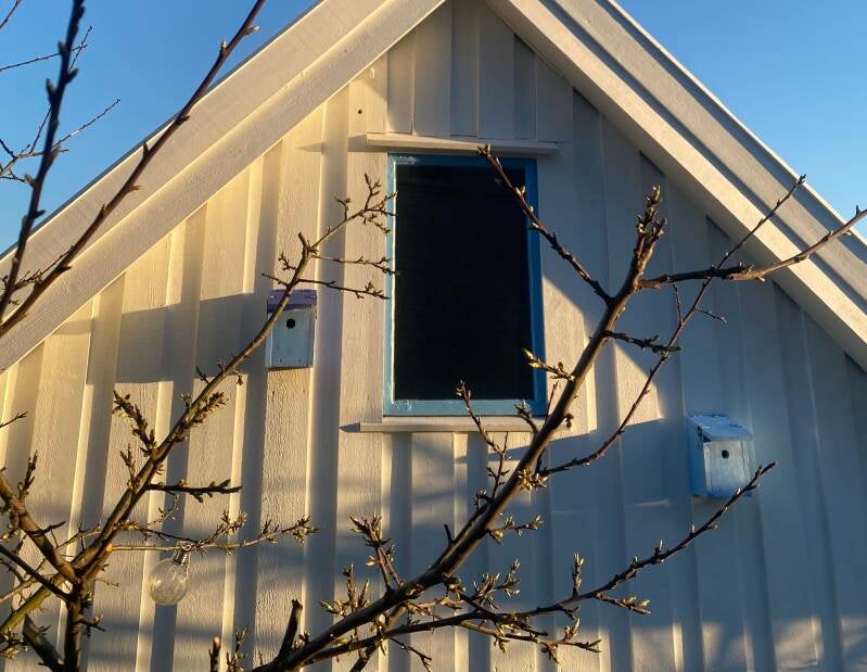 "Kom lille fugl, denne husen er til deg!" sa Hermine (2 år). Begge ungene er veldig krye av produktene sine, og det var superstas å få hengt dem opp! Nå venter vi i spenning for å se om noen vil flytte inn...