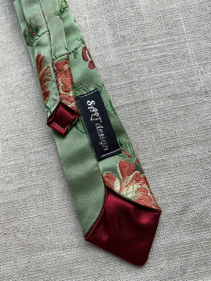 Oliver stiller i skjorte og dressjakke, men han syntes også at dette med bunad/festdrakt så litt stas ut, spesielt da lillesøster fikk. Så kom jeg på posen med de vakre restene som jeg hadde fått av tanten min som syr bunader. Masse avkapp etter ulke bunadsvester, og også et stykke av det røde silkefôret som man har på innsiden av skjørtet i Rogalandsbunaden. Vi gikk i gang med å planlegge! Oliver valgte farger, og så begynte vi å utforme selve slipset, med et gammelt barneslips som mal.
