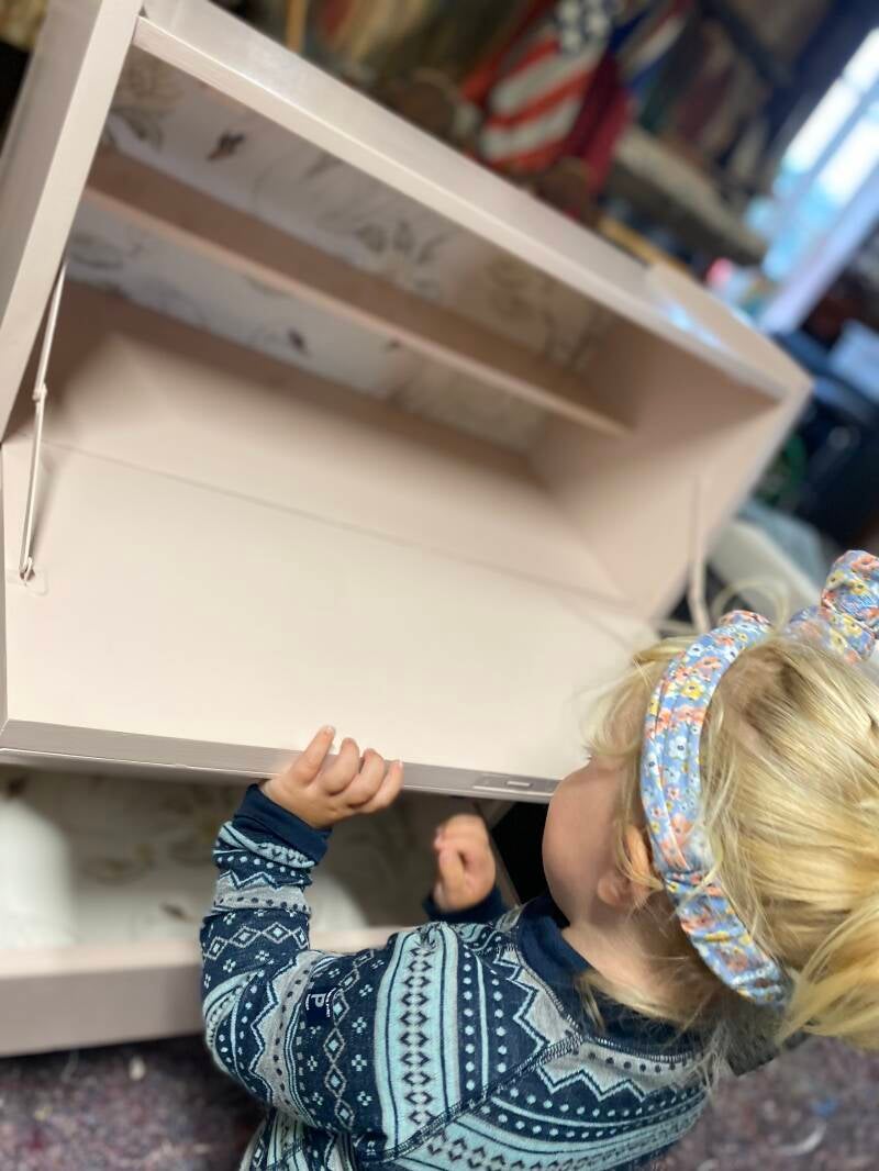 Skrivebordskommode malt i Deco Pink (Jotun), tapet fra Newbie, Boråstapeter.