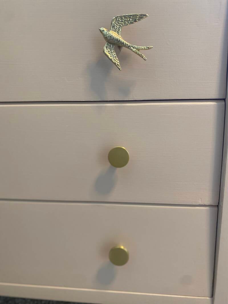 Endelig er Hermines skrivebordskommode ferdig! sjekk gjerne innom mine tidligere innlegg for å se hvor stygg og sliten den egentlig var, men nå er den blitt vakker og ny. More is more, deilig farge, tapet OG nydelige messingknotter. Det ville vært for mye i hvilket som helst annet rom, men absolutt passende på et småjenterom! Her kommer bildene med resultatet: