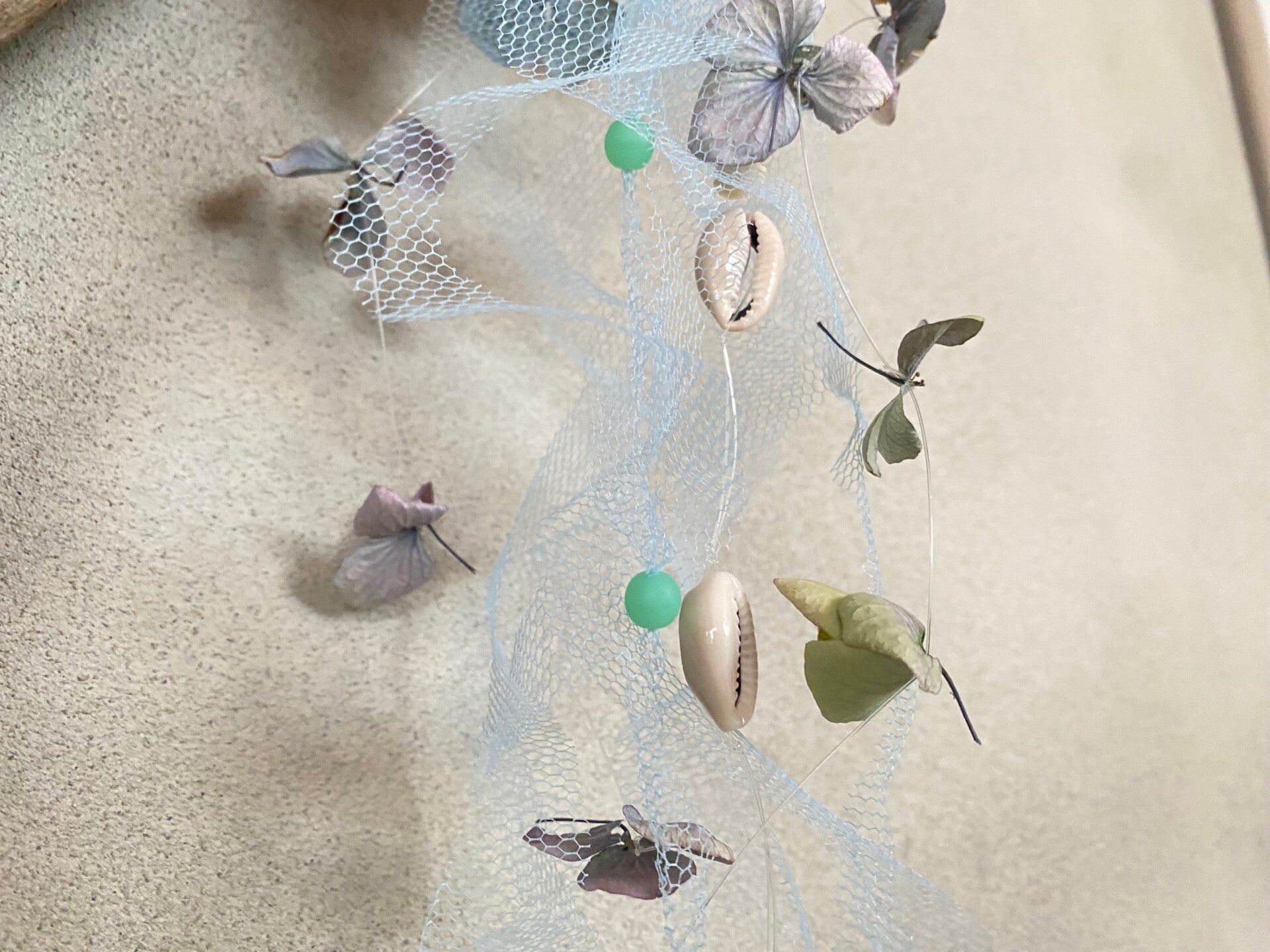 7. Tre perler innpå tyllen i ulike høyder, fest skjell, perler eller tørkede blomster på trådene med sen og dander pent.