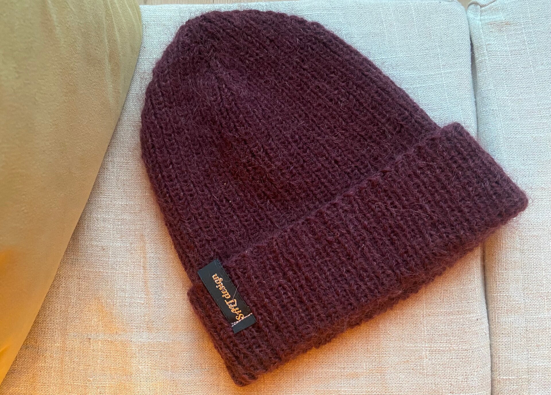 Ulike versjoner av Engøylue strikket i Sandnes Garn Tynn Merino og Sandnes Garn Tynn Silk Mohair. Luen kommer i størrelser til både barn og voksen.