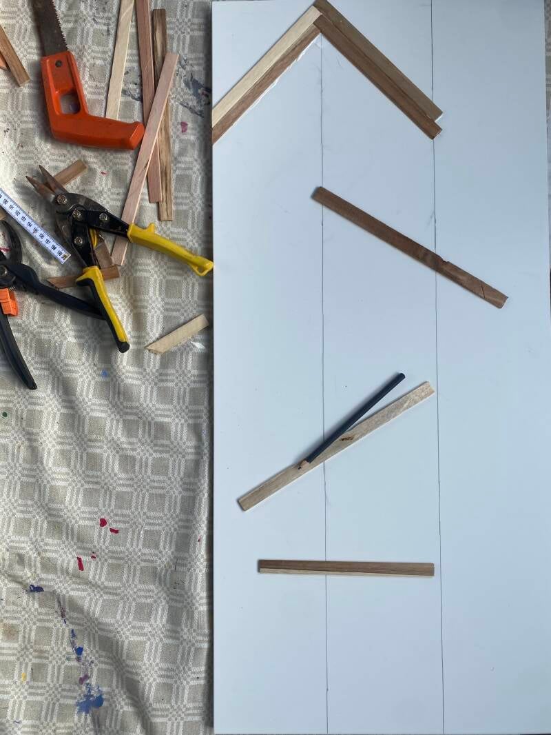 5) Starte med klipping og liming. Siden trespilene var nokså tynne valgte jeg å kappe dem med tang, og så brukte jeg en liten Stanley-kniv til å renskjære kuttet. Spilene ble limt på med trelim.